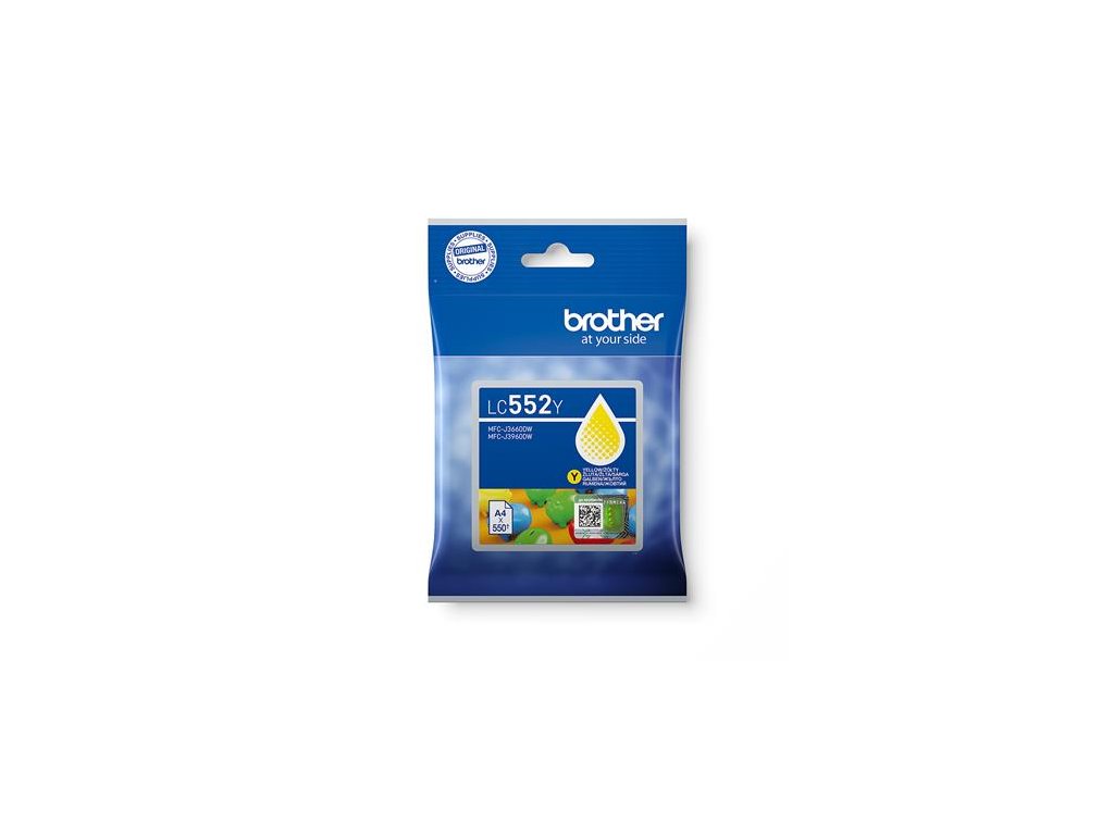Žlutá inkoustová kazeta Brother LC552C – jednotlivé balení. Vytiskne až 550 stran.Plněno pigmentovým inkoustem pro poskytování ostrých, detailních výtisků.