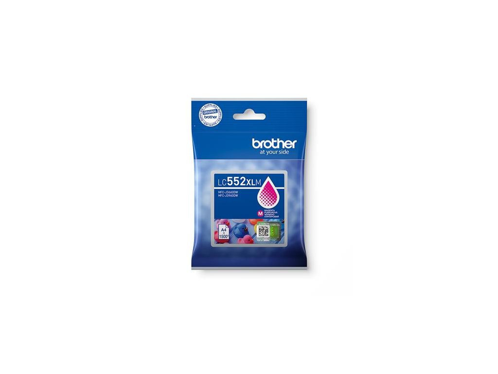 Purpurová inkoustová kazeta Brother LC552XLBK s vysokou výtěžností – jednotlivé balení. Vytiskne až 3 000 stran.Naplněno pigmentovým inkoustem pro ostré a detailní výtisky.