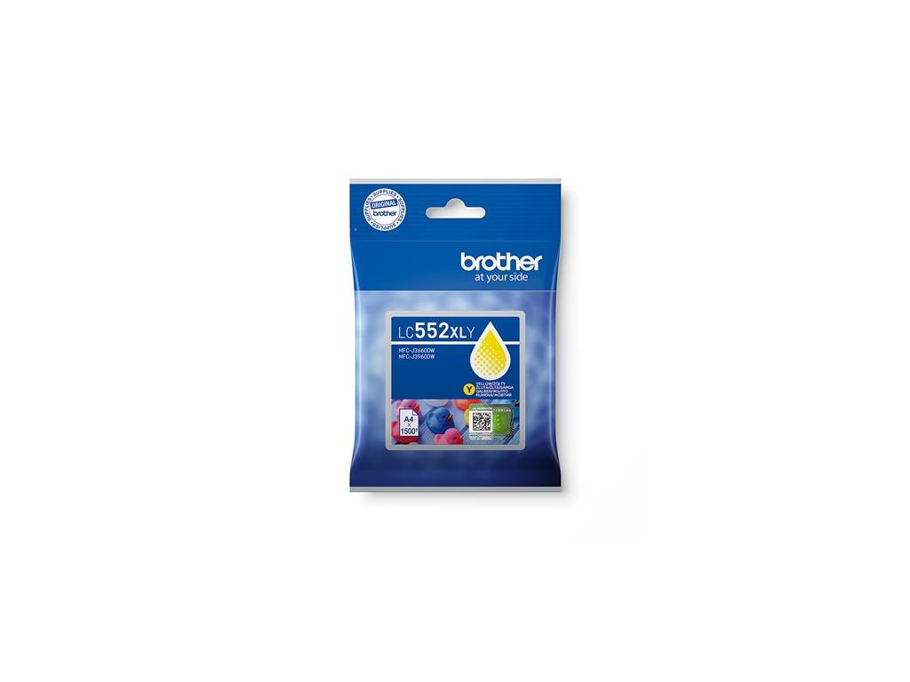Žlutá inkoustová kazeta Brother LC552XLBK s vysokou výtěžností – jednotlivé balení. Vytiskne až 3 000 stran.Naplněno pigmentovým inkoustem pro ostré a detailní výtisky.